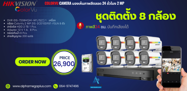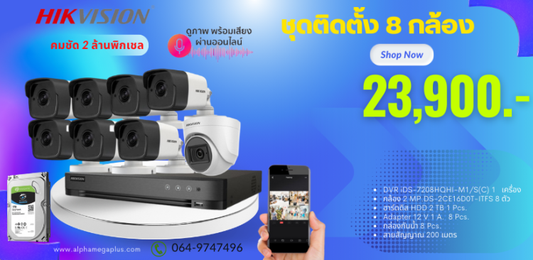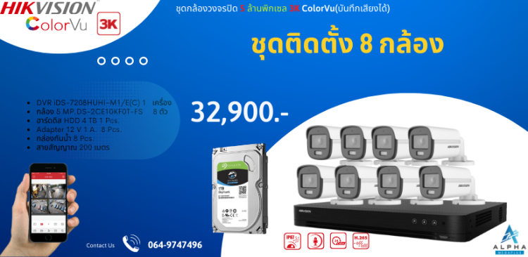 ชุด 8 กล้อง ราคาพร้อมติดตั้งกล้องวงจรปิด HIKVISION ความละเอียด 5 ล้านพิกเชล ภาพสี24 ชม. บันทึกเสียงได้