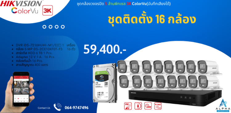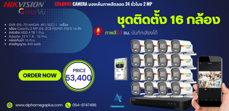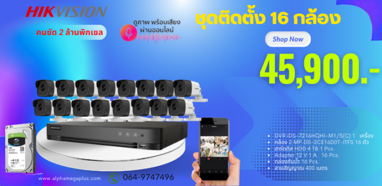 ชุด 16 กล้อง ราคาพร้อมติดตั้งกล้องวงจรปิด HIKVISION ความละเอียด 5 ล้านพิกเชล ภาพสี24 ชม. บันทึกเสียงได้