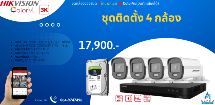 ชุด4 กล้อง ราคาพร้อมติดตั้งกล้องวงจรปิด HIKVISION ความละเอียด 5 ล้านพิกเชล ภาพสี24 ชม. บันทึกเสียงได้