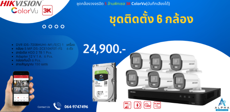 ชุด6 กล้อง ราคาพร้อมติดตั้งกล้องวงจรปิด HIKVISION ความละเอียด 5 ล้านพิกเชล ภาพสี24 ชม. บันทึกเสียงได้